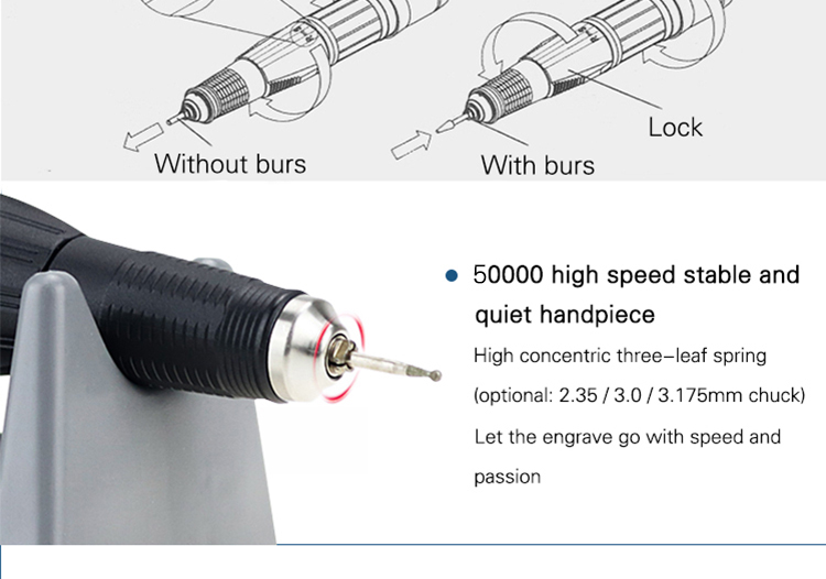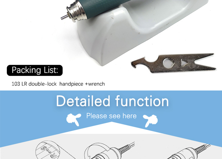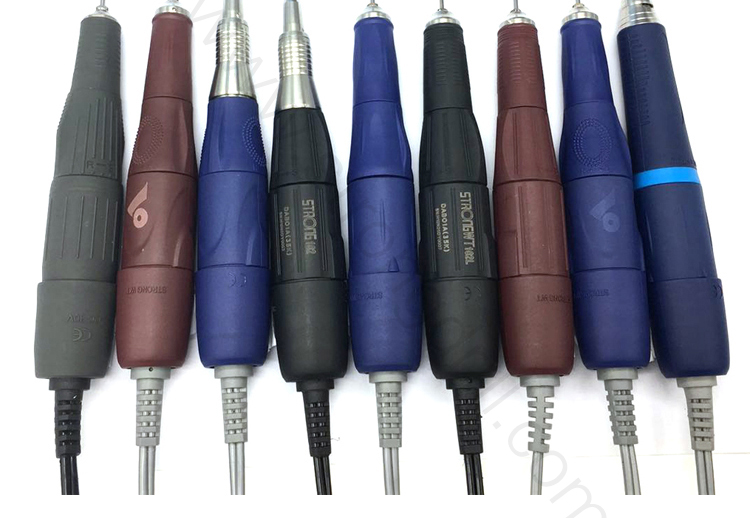 ① When the handle is used, the handle should not be idling, and the grinding pin must be installed. ② When installing the grinding head, the rod of the grinding head must be cleaned and cleaned, and then loaded into the chuck. ③ Don't let water in when you are using the handpiece otherwise the handpiece will be rust. It must clean the water out and make it dry then continue to use if water go into to handpiece. ④ The use of the foot switch must be turned off the host power, otherwise it will affect the performance of the host circuit. ⑤ Don’t hit or make it fall down, especially the handle. ⑥ It is strictly forbidden to refuel the bearings.