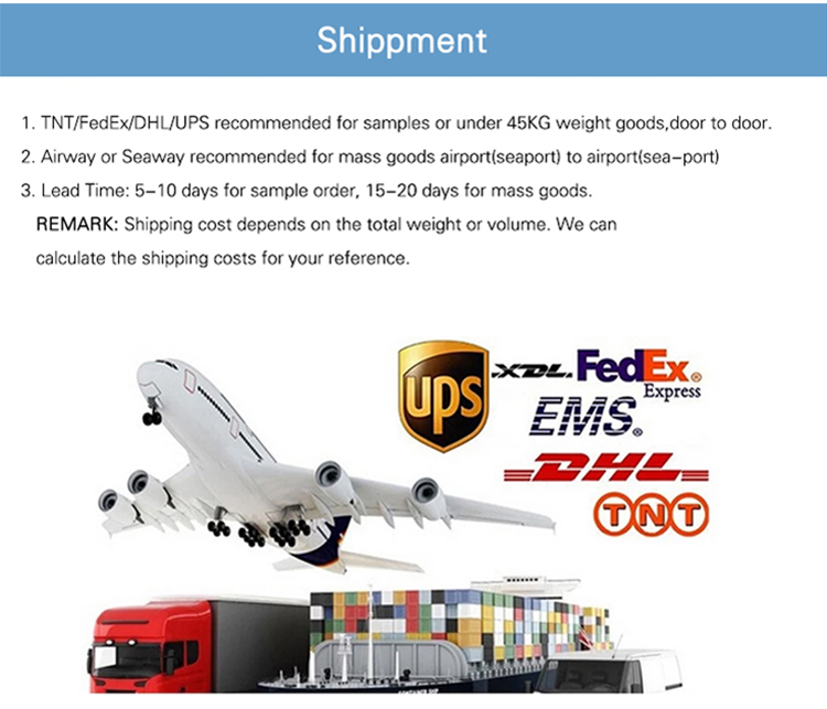 1. TNT/FedEx/DHL/UPS recommended for samples or under 45KG weight goods,door to door. 2. Airway or Seaway recommended for mass goods airport(seaport) to airport(sea-port) 3. Lead Time: 5-10 days for sample order, 15-20 days for mass goods. REMARK: Shipping cost depends on the total weight or volume. We can calculate the shipping costs for your reference.