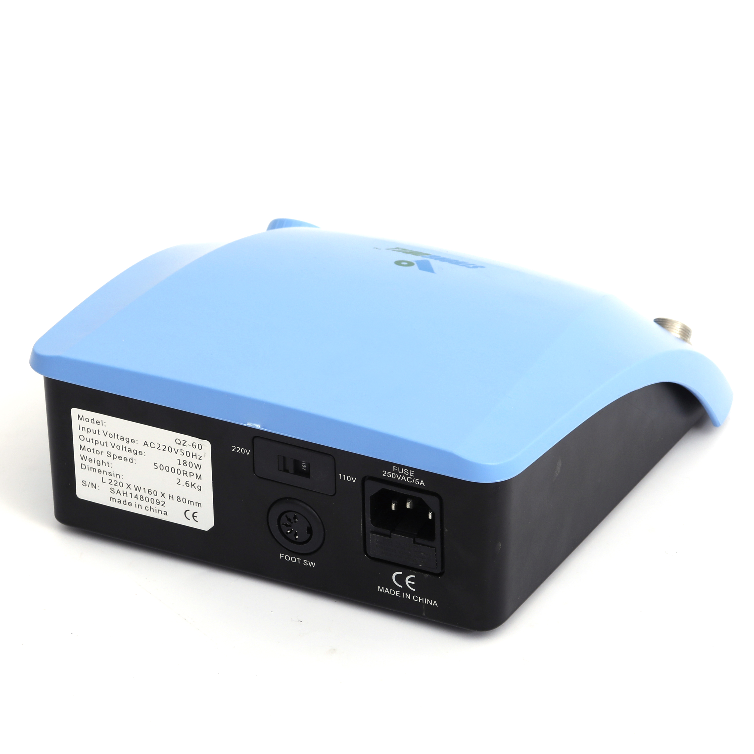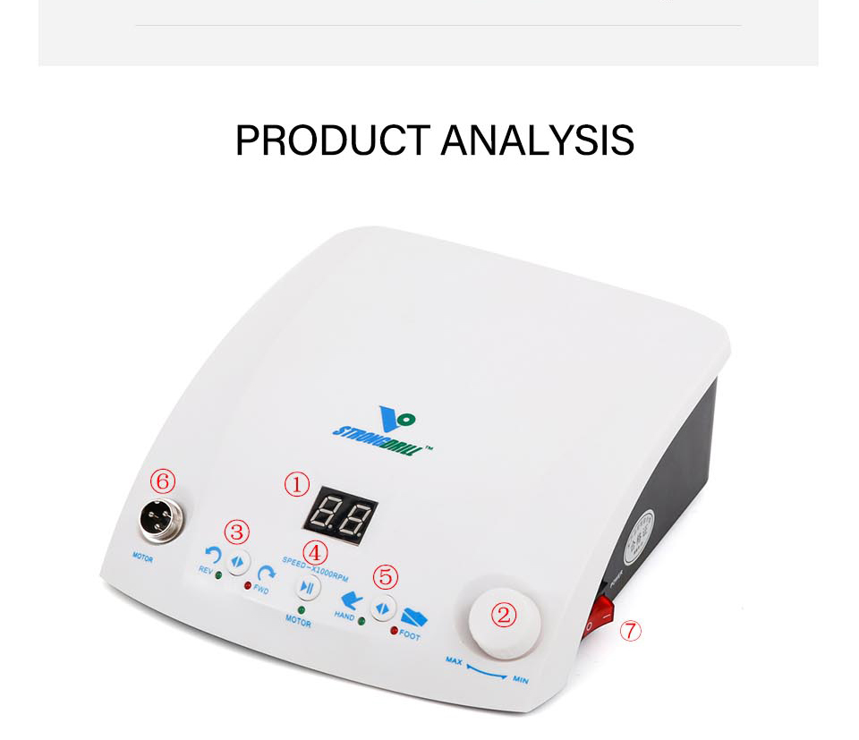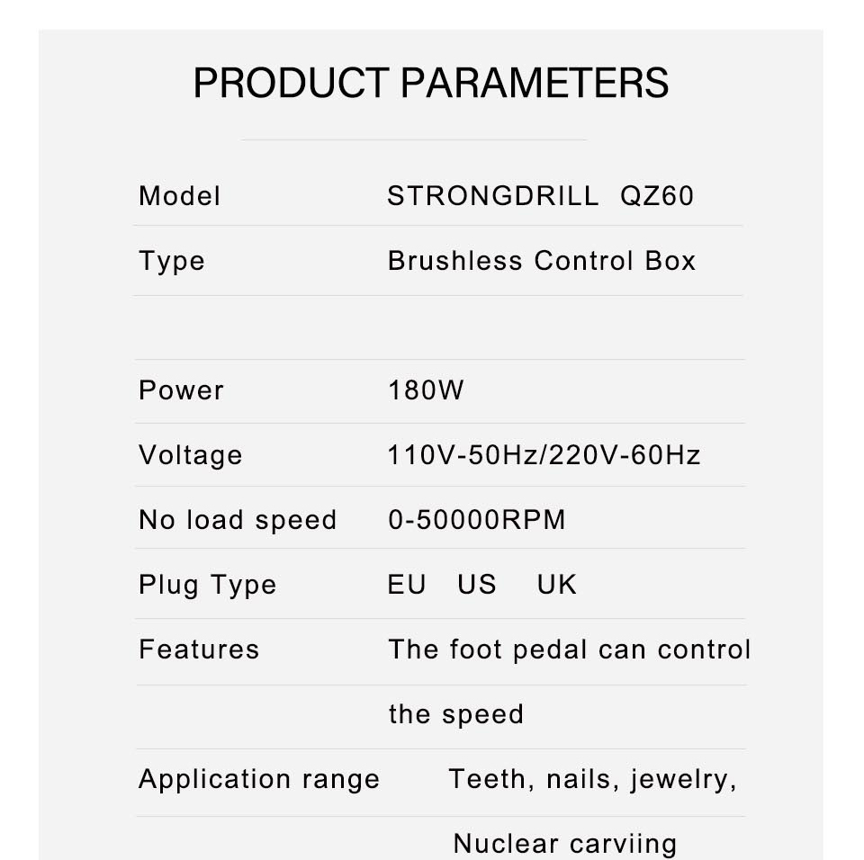 Model STRONGdrill QZ60 Type Brushless Control Box Power 180W Voltage 110V-50Hz/220V-60Hz No load speed 0-50000RPM Plug Type EU US UK Features The foot pedal can control the speed Application range Teeth, nails, jewelry, Nuclear carviing