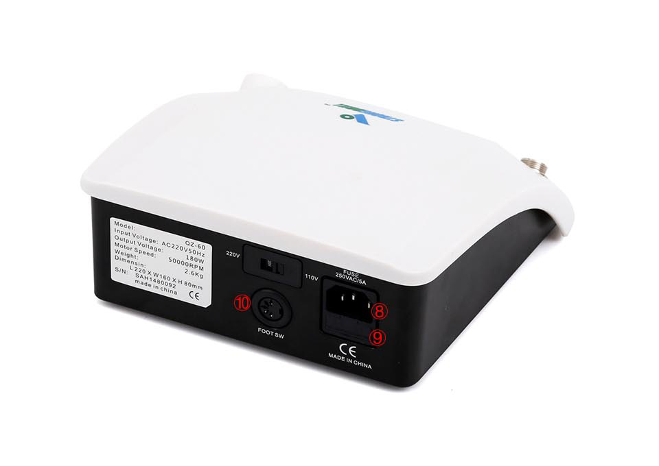 1Speed display 2 Speed control knob 3 Positive / reverse buttor 4 Start / pause button 5 Pedal / manual toggle button 6 Handpiece connectior 7 Main power switch 8 Fuse slo 9 Power jack 10 onnecting the pedal jack