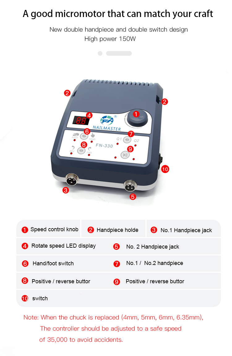 Note: When the chuck is replaced (4mm, 5mm, 6mm, 6.35mm),The controller should be adjusted to a safe speed of 35,000 to avoid accidents.