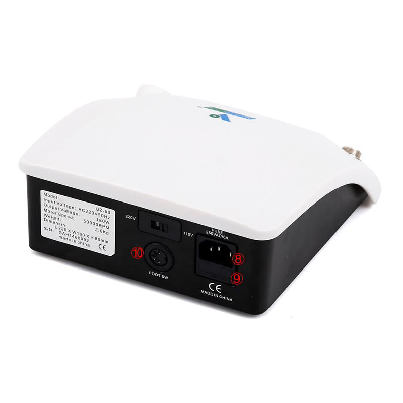 1Speed display 2 Speed control knob 3 Positive / reverse buttor 4 Start / pause button 5 Pedal / manual toggle button 6 Handpiece connectior 7 Main power switch 8 Fuse slo 9 Power jack 10 onnecting the pedal jack
