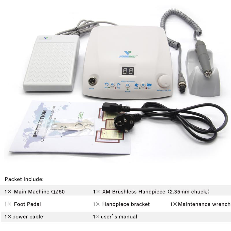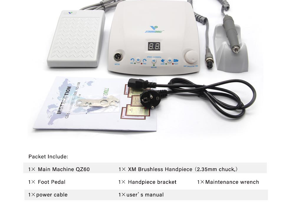 1× Main Machine QZ600 1× XM Brushless Handpiece (2.35mm chuck,) 1× Foot Pedal 1× Handpiece bracket 1×power cable 1×user's manual 1×Maintenance Wrench