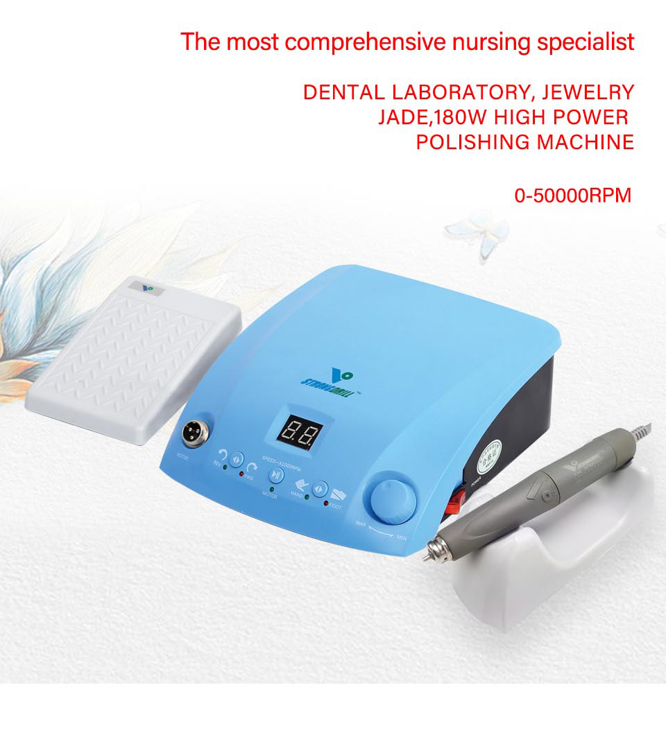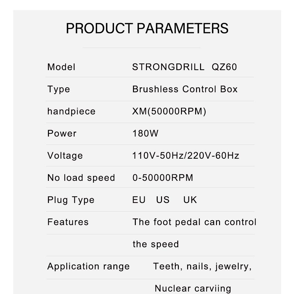 NAILPOLISHING MACHINE Model STRONGdrill QZ60 Type Brushless Control Box handpiece XIAOMI(50000RPM) Power 180W Voltage 110V-50Hz/220V-60Hz No load speed 0-50000RPM Plug Type EU US UK Features The foot pedal can control the speed Application range Teeth, nails, jewelry
