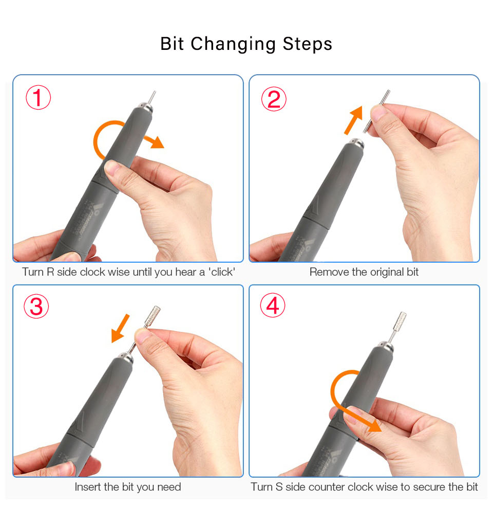 Precautions:① When the handle is used, the handle should not be idling, and the grinding pin must be installed. ② When installing the grinding head, the rod of the grinding head must be cleaned and cleaned, and then loaded into the chuck. ③ Don't let water in when you are using the handpiece otherwise the handpiece will be rust. It must clean the water out and make it dry then continue to use if water go into to handpiece. ④ The use of the foot switch must be turned off the host power, otherwise it will affect the performance of the host circuit. ⑤ Don’t hit or make it fall down, especially the handle. ⑥ It is strictly forbidden to refuel the bearings.